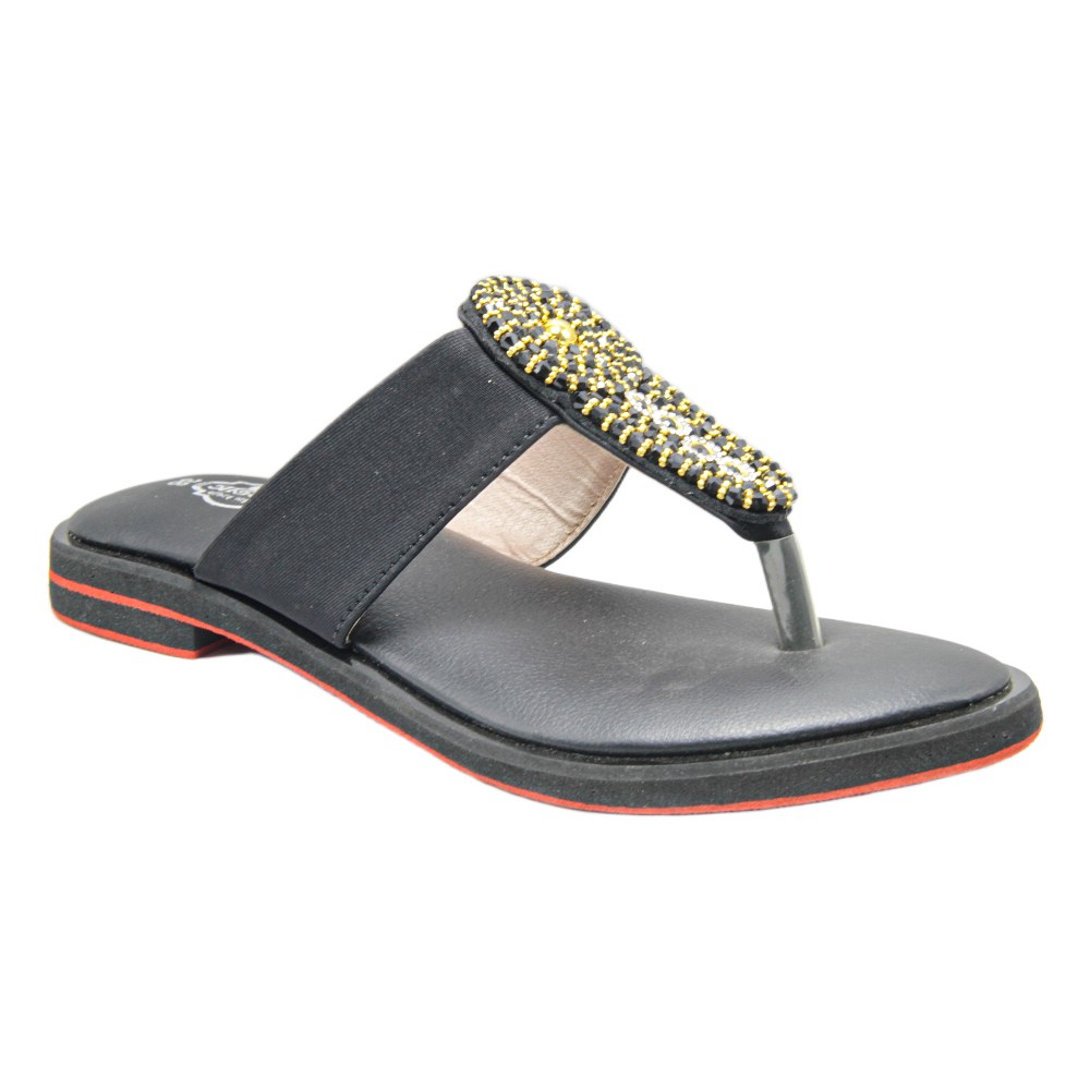 Make a bold statement with these opulent black and gold sandals, designed to add a touch of royal elegance to your festive attire. The upper is defined by a wide, comfortable strap heavily embellished with shimmering gold beads and black stones, creating a sunburst-inspired pattern that serves as a stunning focal point. Designed for the woman who loves to stand out at weddings or evening gatherings, these flats offer a glamorous alternative to heels without compromising on style.