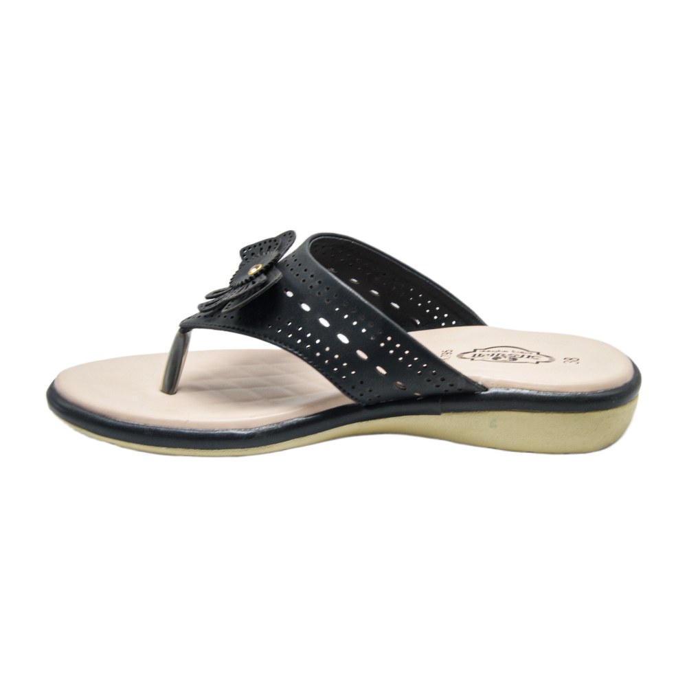 Step out in style and comfort with these sophisticated black thong-style wedge sandals. Designed for the modern woman who values both aesthetics and ease, this pair features a beautifully detailed laser-cut upper adorned with a delicate 3D floral accent. The neutral cream-toned footbed provides a sharp visual contrast, while the modest wedge heel offers just the right amount of lift for all-day wear. Whether you're heading to a casual brunch or a festive gathering, these sandals ensure a polished and graceful look.