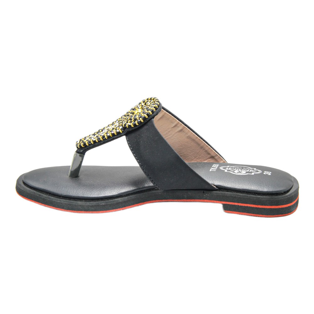 Make a bold statement with these opulent black and gold sandals, designed to add a touch of royal elegance to your festive attire. The upper is defined by a wide, comfortable strap heavily embellished with shimmering gold beads and black stones, creating a sunburst-inspired pattern that serves as a stunning focal point. Designed for the woman who loves to stand out at weddings or evening gatherings, these flats offer a glamorous alternative to heels without compromising on style.