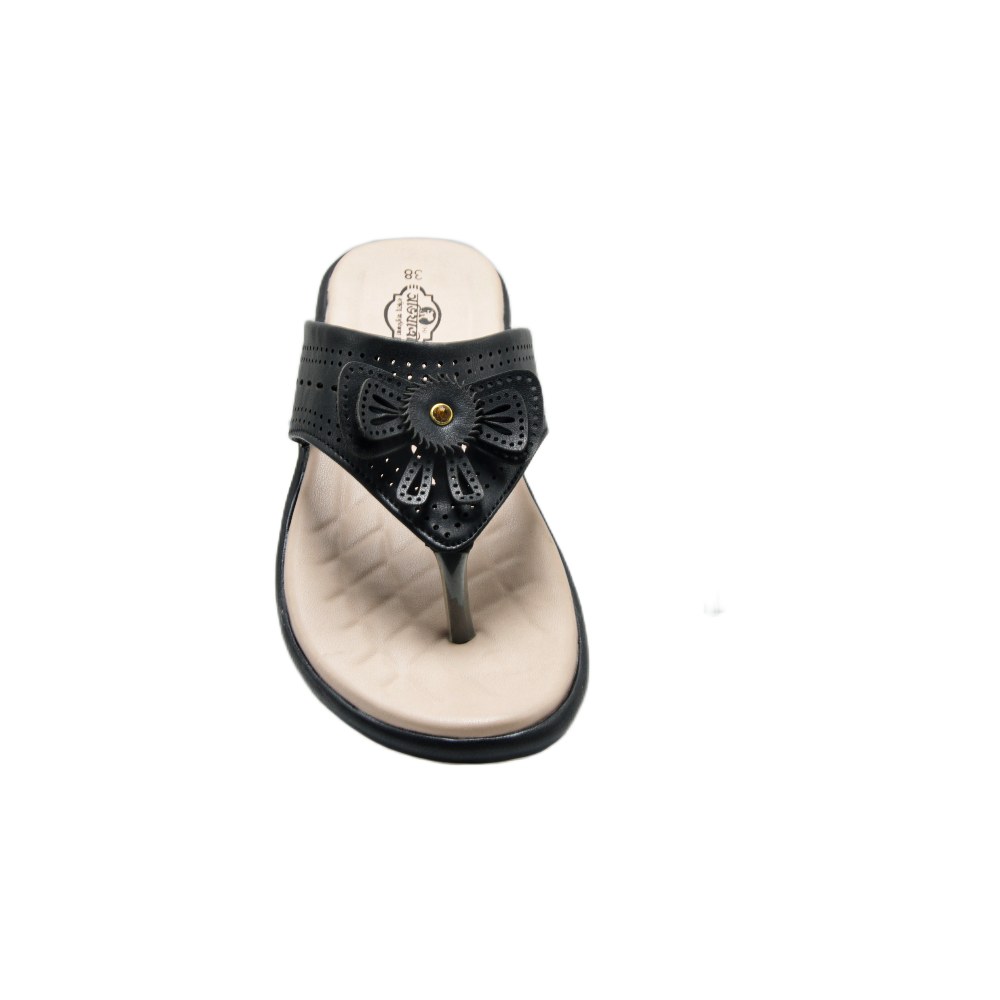 Step out in style and comfort with these sophisticated black thong-style wedge sandals. Designed for the modern woman who values both aesthetics and ease, this pair features a beautifully detailed laser-cut upper adorned with a delicate 3D floral accent. The neutral cream-toned footbed provides a sharp visual contrast, while the modest wedge heel offers just the right amount of lift for all-day wear. Whether you're heading to a casual brunch or a festive gathering, these sandals ensure a polished and graceful look.